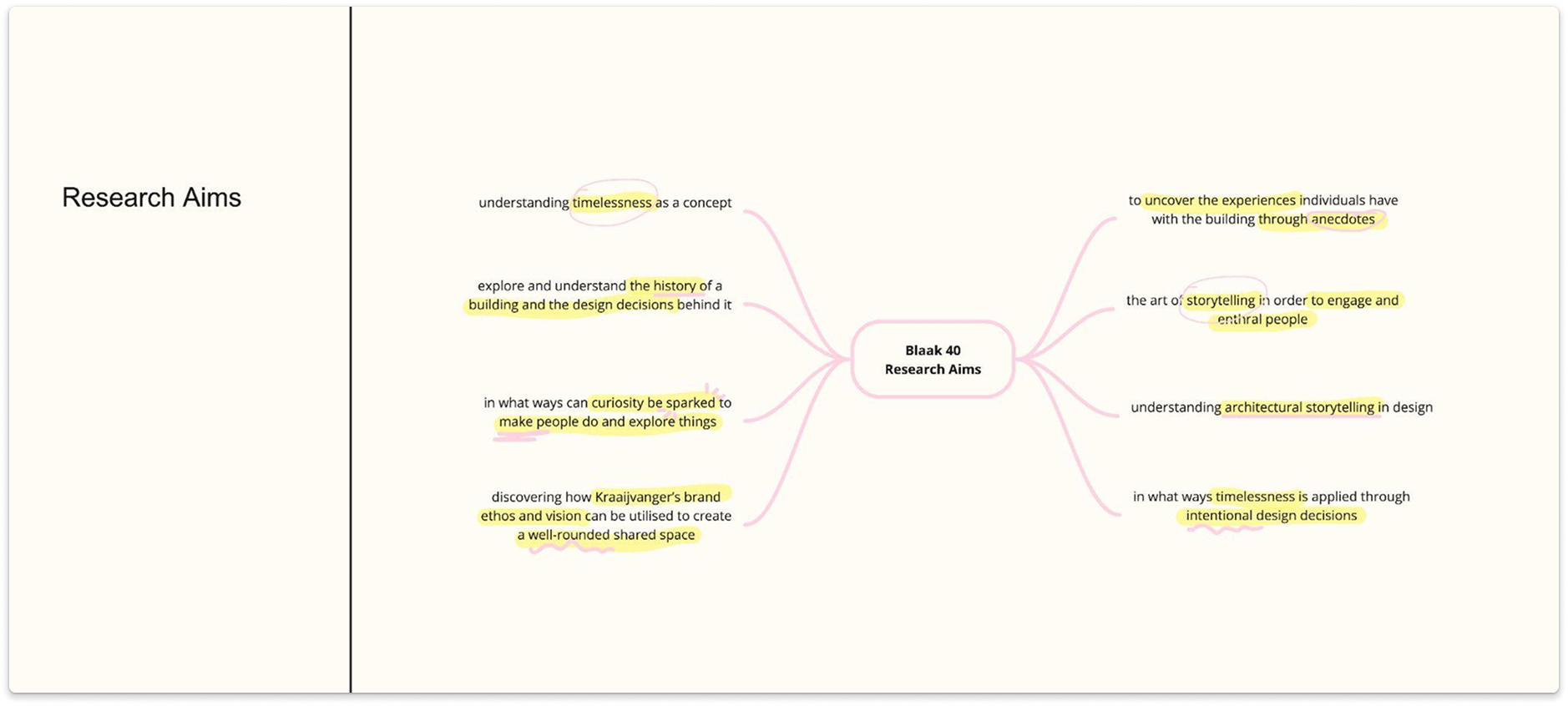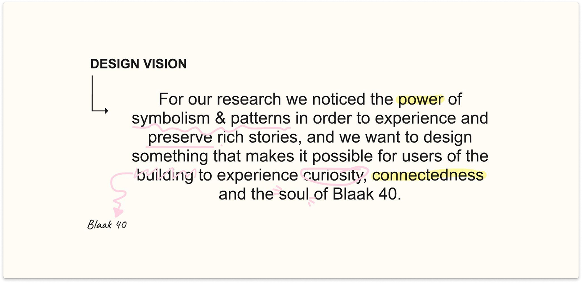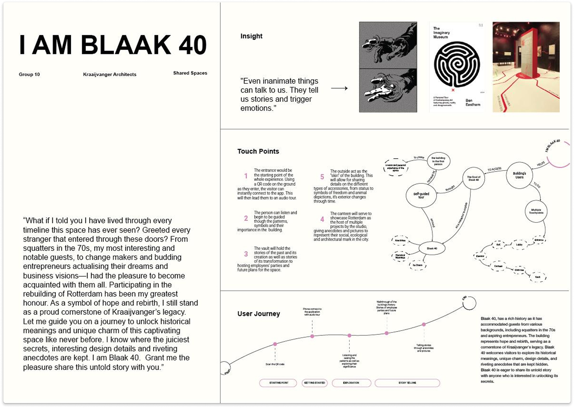 During the stakeholder map development we decided to do something unconventional, present the building as its own person. Kraaijvangers have been questioning what their buildings are like after the development, who they serve, what stories they tell. We have taken this as an important anchor in our thought and ideation processes. In result all following decisions our team took was to have in mind Blaak 40 as its own being.